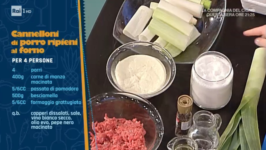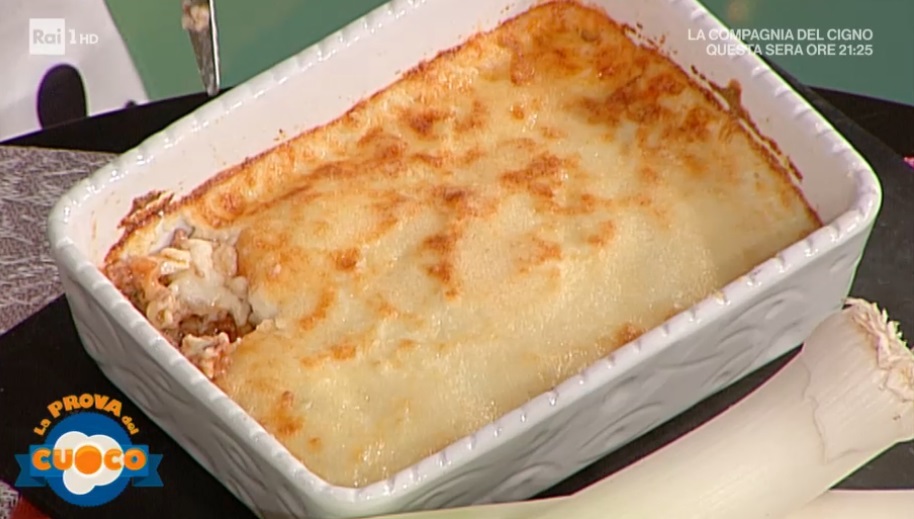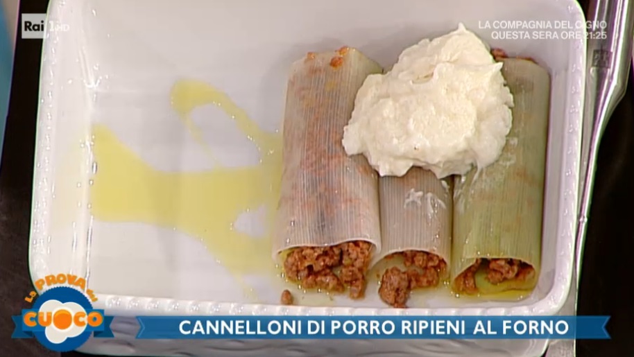 Farciamo i cannelloni di porro sbollentati con il ripieno. Li adagiamo all’interno di una pirofila unta d’olio. Copriamo con la besciamella, spolveriamo con il formaggio grattugiato ed inforniamo a 180° per 20 minuti.
