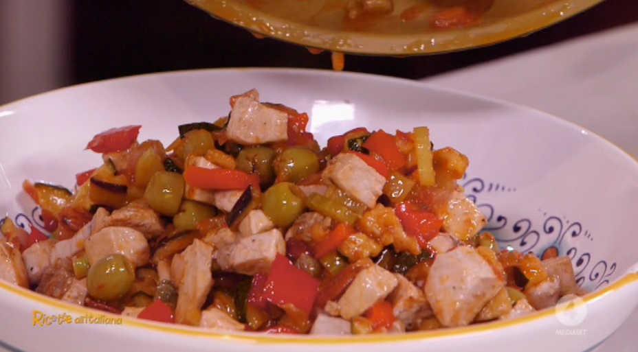 In una padella capiente, facciamo soffriggere la cipolla rossa tritata con un filo d’olio ed un goccio d’acqua. Puliamo il sedano, eliminando i filamente, lo tagliamo a quadratini e lo sbollentiamo per pochi minuti. Scoliamo e lo uniamo alla cipolla stufata. A questo punto, uniamo le melanzane, i peperoni e le zucchine a cubetti, precedentemente soffritti. Saliamo, pepiamo ed uniamo la polpa di pomodoro; lasciamo insaporire qualche minuto. Uniamo le olive verdi denocciolate e a pezzetti, i capperi dissalati e le mandorle a scaglie.