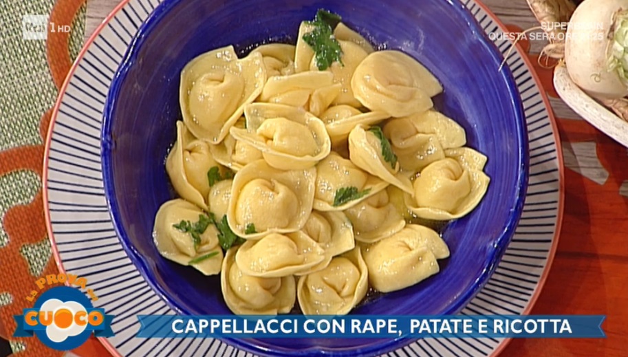 Formiamo delle noci di ripieno sui dischetti di pasta all’uovo. Richiudiamo in modo da ottenere una mezzaluna, poi il cappellaccio. Lessiamo in acqua bollente e salata per pochi istanti (3 minuti circa). Scoliamo e ripassiamo in padella con olio evo, colatura di alici e prezzemolo fresco tritato. Spolveriamo con del formaggio grattugiato e serviamo.