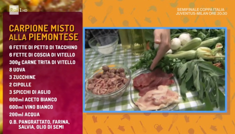 - 6 fette petto di tacchino, 6 fette di coscia di vitello, 300 g carne trita di vitello, 8 uova, 3 zucchine, 2 cipolle, 3 spicchi d’aglio, 600 ml aceto bianco, 600 ml vino bianco, 200 ml acqua, pangrattato, farina, salvia, olio di semi