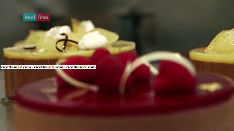 Foderare un anello per mousse con acetato, coprire la base con un disco di marquise, aggiungere la mousse, stando 4mm sotto al bordo dell’anello. Mettere in frigorifero per 2 ore, dopo di che versare sopra la gelatina calda. Rimettere in frigorifero per altre 2 ore per stabilizzare la mousse.
