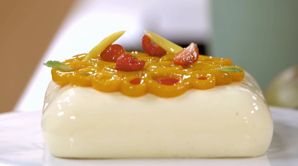 - Per la gelèe: 150 g mango (polpa), 50 g zucchero, 100 g frutto della passione (polpa), 5 g gelatina in fogli
