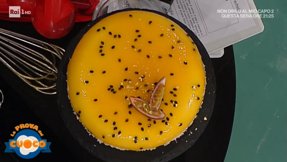 Versiamo la gelatina al frutto della passione sul dolce congelato, facendo colare via l’eccesso. Decoriamo i bordi con della farina di cocco.
