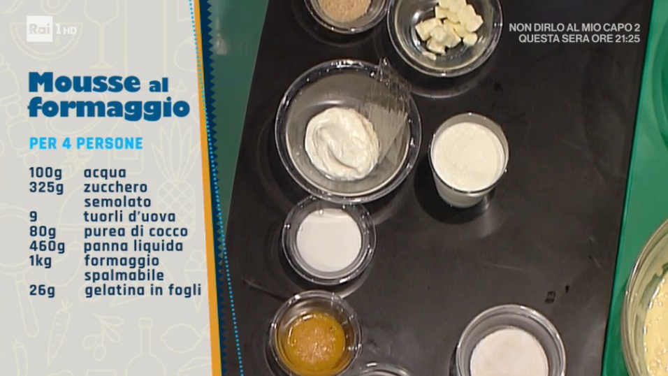 - Mousse al formaggio: 100 g acqua, 325 g zucchero semolato, 9 tuorli, 80 g purea di cocco, 460 g panna liquida, 1 Kg formaggio spalmabile, 26 g gelatina in fogli