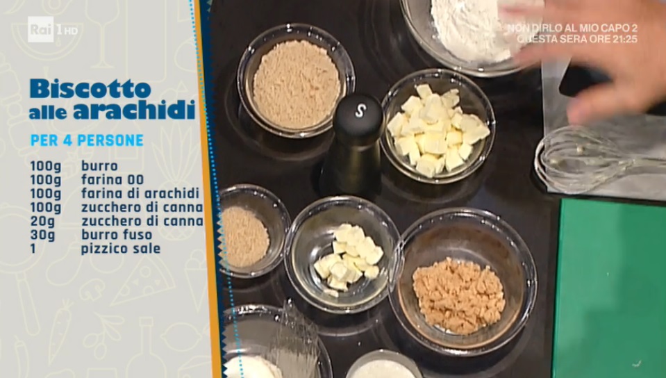 - Biscotto alle arachidi: 100 g burro, 100 g farina 00, 100 g farina di arachidi, 100 g zucchero di canna, 20 g zucchero di canna, 30 g burro fuso, pizzico di sale