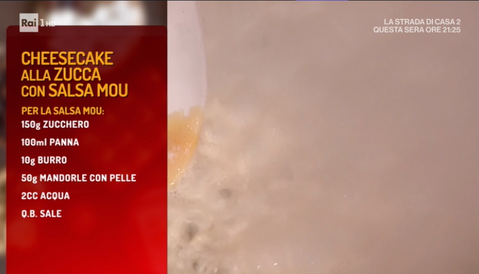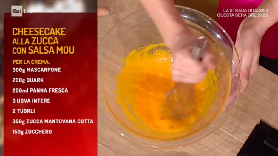 - Crema: 300 g mascarpone, 200 g formaggio quark, 200 ml panna fresca, 3 uova intere, 2 tuorli, 350 g zucca mantovana cotta, 150 g zucchero
