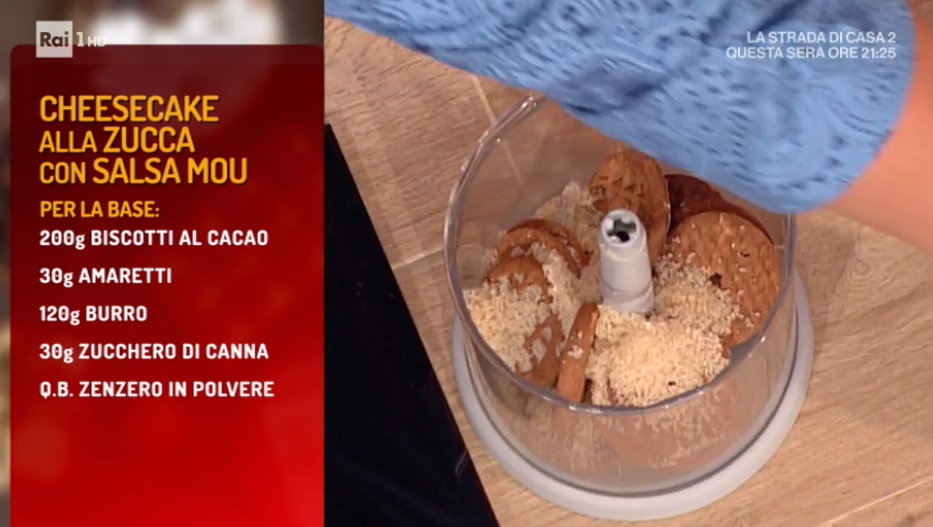 - Base: 200 g biscotti al cacao, 30 g amaretti, 120 g burro, 30 g zucchero di canna, zenzero in polvere