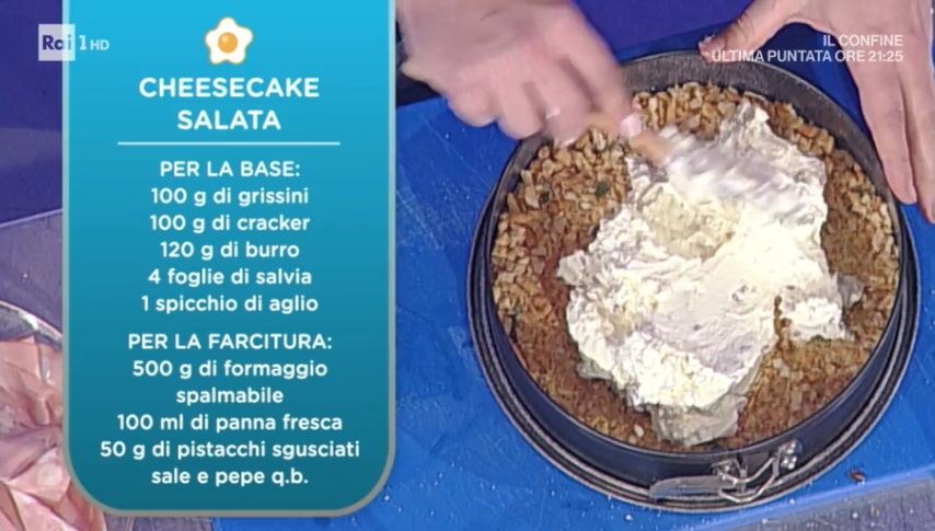 Prepariamo la base. In un mixer, mettiamo i grissini o i crackers avanzati. In un pentolino, facciamo fondere il burro con uno spicchio d’aglio e la salvia. Dopo qualche minuto, uniamo il burro fuso ed aromatizzato ai grissini, eliminando l’aglio. Tritiamo il tutto finemente, fino ad ottenere un composto omogeneo. Distribuiamo il composto ottenuto sulla base di una tortiera imburrata di 28 cm circa, pressando con un cucchiaio. Mettiamo in frigorifero ad indurire, per almeno 10 minuti.
