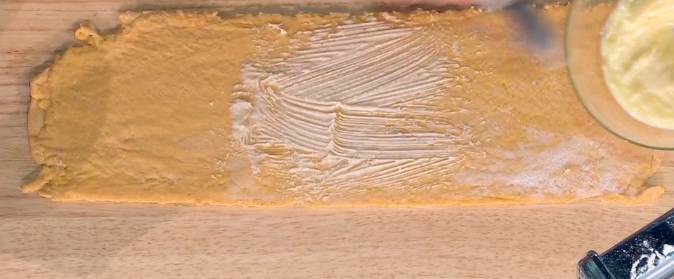 Con la nonna papera (la sfogliatrice della pasta all’uovo), tiriamo una sfoglia non troppo sottile (dev’essere ben fredda). Sulla metà della sfoglia, spalmiamo il burro a pomata (non caldo). Ripieghiamo la sfoglia sul burro e ripassiamo nella macchinetta. Ripetiamo la sfogliatura.
