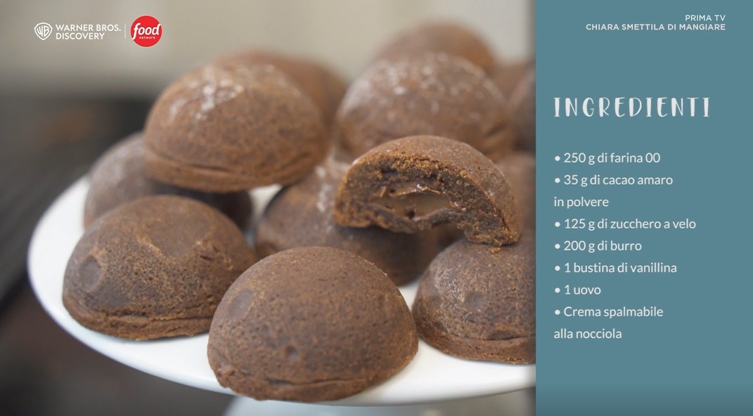 Stendiamo la frolla ad uno spessore di 2-3 mm e ritagliamo dei dischetti, che inseriamo in stampi di silicone a mezzasfera. Farciamo le mezzesfere ancora crude con la crema spalmabile al cioccolato. Spennelliamo i bordi della frolla con poco albume, quindi sovrapponiamo altri dischetti di frolla, in modo da sigillare all’interno la crema. Mettiamo a riposare per mezz’ora in frigorifero. Cuociamo in forno caldo e statico a 180° per 15 minuti.