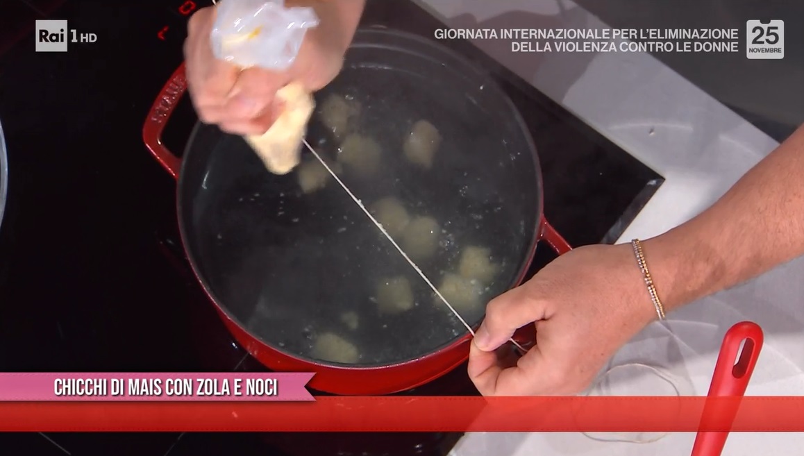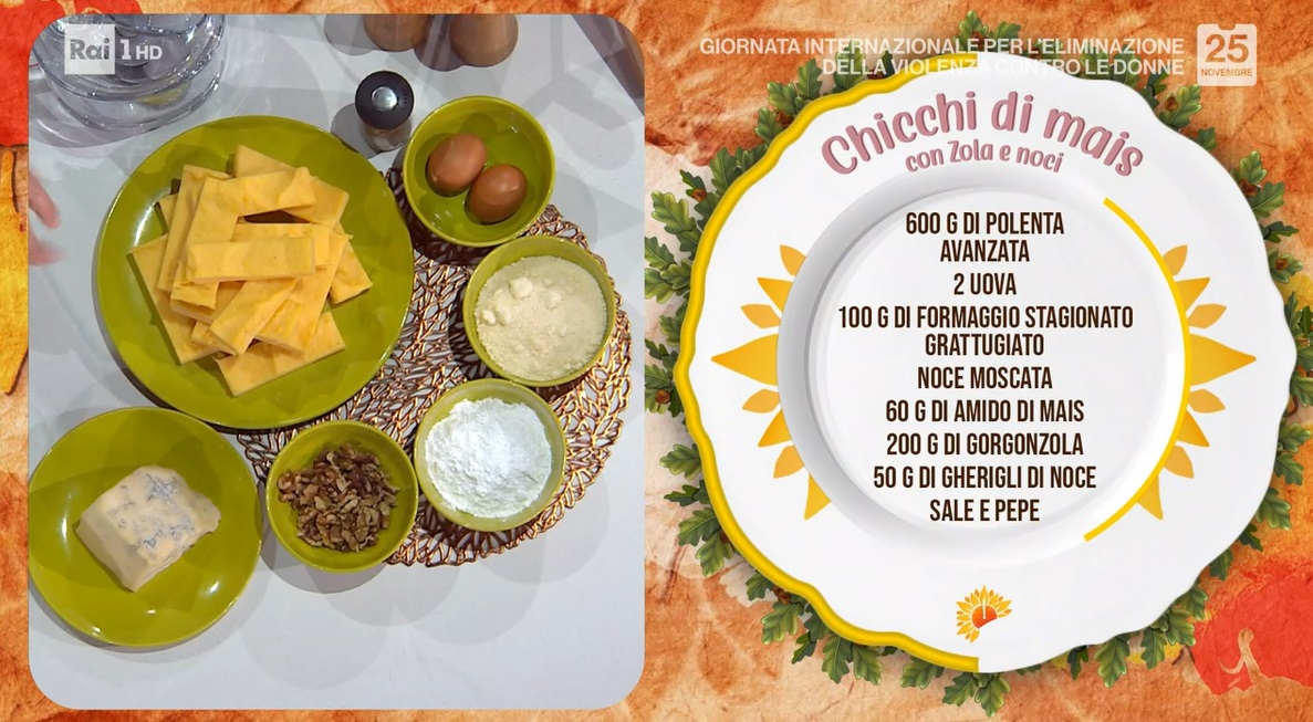 - 600 g polenta avanzata, 2 uova, 100 g formaggio grattugiato, noce moscata, 60 g amido di mais, 200 g gorgonzola, 50 g noci, sale e pepe