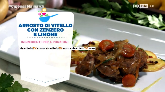 In una casseruola mettere a freddo: muscolo di vitello legato con lo spago , carote, sedano, aglio, cipolla, burro, rosmarino, pepe, sale, e lasciare cuocere con brodo vegetale e vino bianco. A metà cottura aggiungere zenzero e limone. Per le patate al cartoccio. Su un foglio di carta stagnola mettere le patate tagliate a rondelle, olio, sale, pancetta ed erba cipollina. Chiudere a pacchetto e infornare a 220 per 25 minuti.