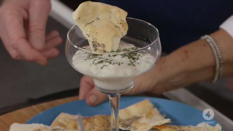 Serviamo la crema di baccalà con una spolverata di prezzemolo tritato e le cialdine di brisè.