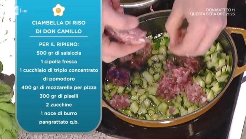 • Ripieno: 500 g salsiccia, 1 cipolla fresca, 1 cucchiaio di concentrato di pomodoro, 400 g mozzarella per pizza, 300 g piselli, 2 zucchine, 1 noce di burro, pangrattato
