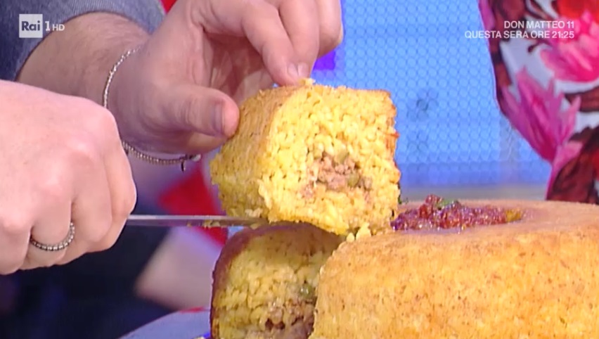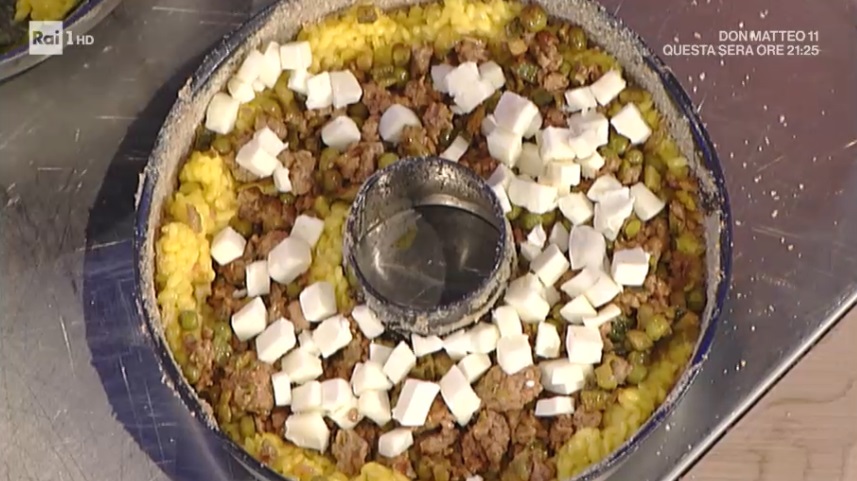 Componiamo: all’interno di uno stampo a ciambella imburrato e spolverato con pangrattato, formiamo un primo strato di riso tiepido. Al centro, con un cucchiaio, formiamo una sorta di incavo. Mettiamo tutto il ragù di salsiccia all’interno dell’incavo. Copriamo con la mozzarella da pizza a cubetti piccoli e finiamo con l’altra metà del risotto, che deve coprire per bene il ripieno. Pressiamo ed inforniamo a 180° per 45 minuti.