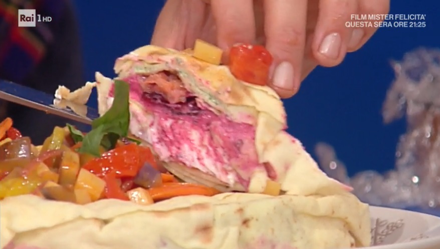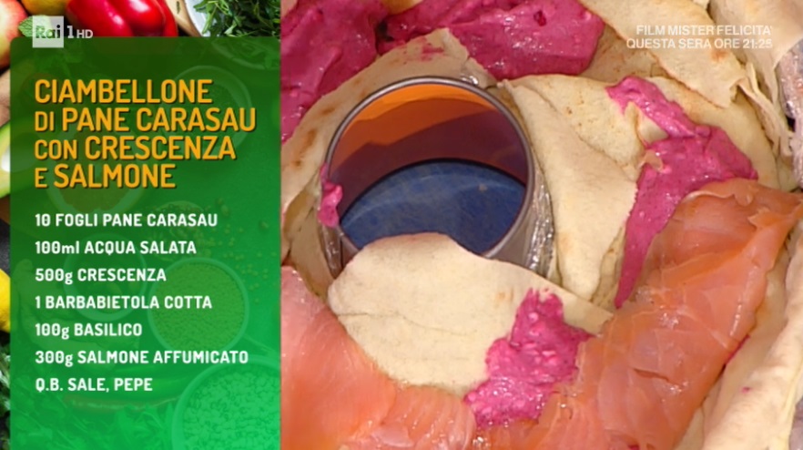 Posizioniamo le sfoglie di carasau ormai morbide all’interno della tortiera a ciambella, in modo da coprire il fondo ed i lati. Spalmiamo sul fondo la crescenza verde (al basilico). Copriamo con altro pane carasau e distribuiamo sopra metà del salmone affumicato affettato. Copriamo con altro pane carasau e spalmiamo sopra la crescenza alla barbabietola. Distribuiamo sopra il salmone rimasto e copriamo con del pane carasau. Ancora uno strato di pane carasau, la crescenza bianca e, per finire, il pane carasau, ripiegando verso l’interno anche i lembi finora sui bordi della tortiera. Copriamo con la pellicola e lasciamo riposare in frigorifero.