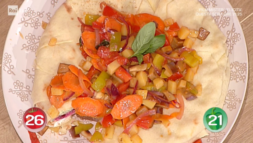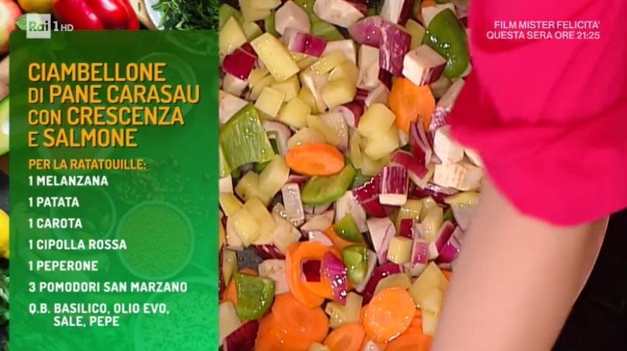 - Ratatouille: 1 melanzana, 1 patata, 1 carota, 1 cipolla rossa, 1 peperone, 3 pomodori San Marzano, basilico, olio, sale, pepe