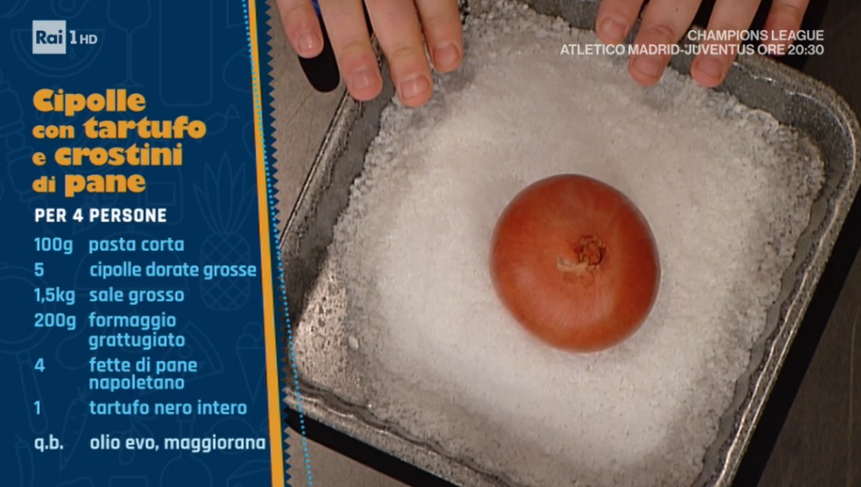 - 100 g pasta corta, 5 cipolle dorate grosse, 1,5 Kg sale grosso, 200 g formaggio grattugiato, 4 fette di pane napoletano, 1 tartufo nero intero, olio, maggiorana