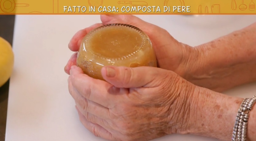 La cuoca casalinga Anna Moroni, reduce da una pluriennale esperienza ai fornelli de La prova del cuoco, all’interno della puntata odierna di Ricette all’italiana, il programma di Rete4 condotto da Davide Mengacci, ha preparato la composta di pere.