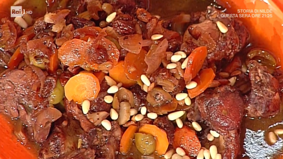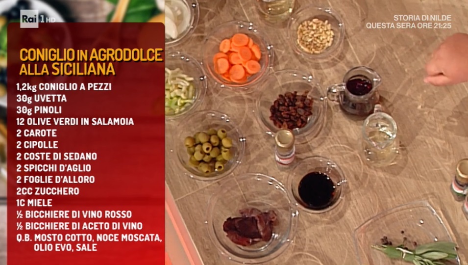 - 1,2 Kg coniglio a pezzi, 30 g uvetta, 30 g pinoli, 12 olive verdi in salamoia, 2 carote, 2 cipolle, 2 coste di sedano, 2 spicchi d’aglio, 2 foglie di alloro, 2 cc zucchero, 1 c miele, mezzo bicchiere di vino rosso, mezzo bicchiere di aceto di vino, mosto cotto, noce moscata, olio evo, sale