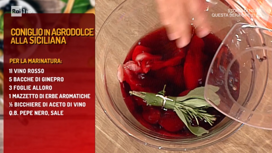 Mettiamo il coniglio in una ciotola e lo copriamo con il vino rosso, un goccio d’aceto, un mazzetto di aromi (salvia, rosmarino ed alloro), bacche di ginepro, pepe nero, un pizzico di sale. Copriamo con la pellicola e lasciamo macerare per una notte in frigorifero.