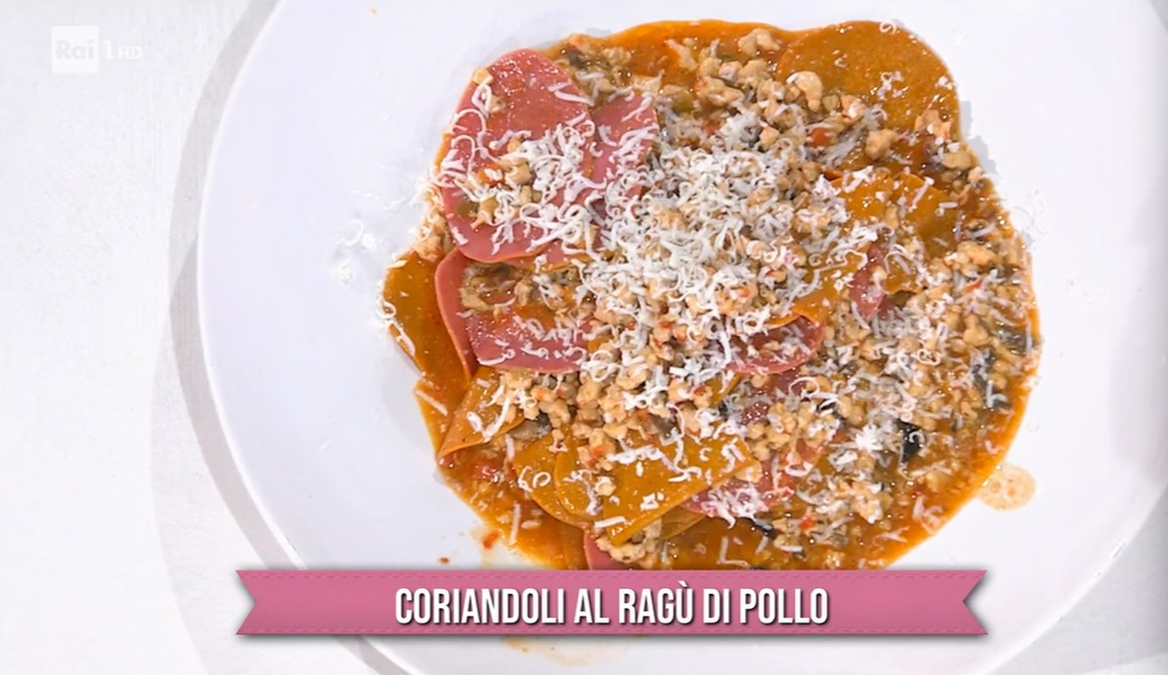 Tiriamo le sfoglie di pasta colorata, ne spennelliamo la superficie con poca acqua e sovrapponiamo le due sfoglie, facendole aderire. Ritagliamo dei tondini, i coriandoli. Li cuociamo in acqua bollente e salata per il tempo necessario. Scoliamo e ripassiamo in padella con il ragù. Serviamo con ricotta salata grattugiata.