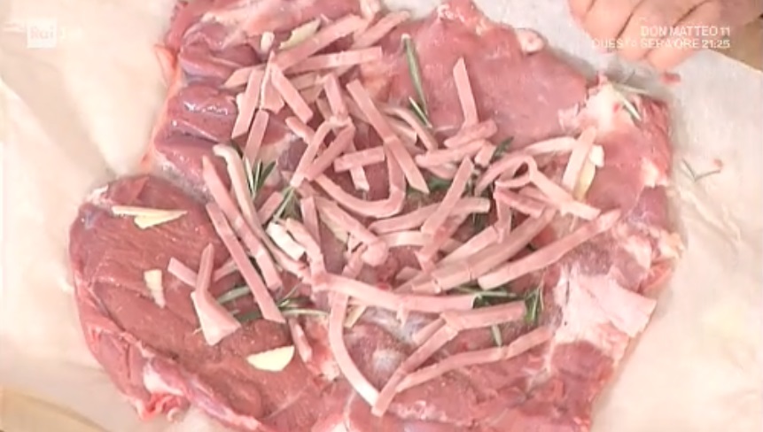 Compriamo un cosciotto d’agnello già disossato. Lo battiamo con l’apposito attrezzo e lo condiamo con sale, rosmarino ed aglio tritato. Sul ‘rettangolo’ di agnello disponiamo il prosciutto cotto a listarelle. Arrotoliamo stretto e fermiamo le estremità della carta forno, in modo da ottenere una caramella. Inforniamo per 45 minuti a 180°. Possiamo preparare l’arrosto anche il giorno prima.