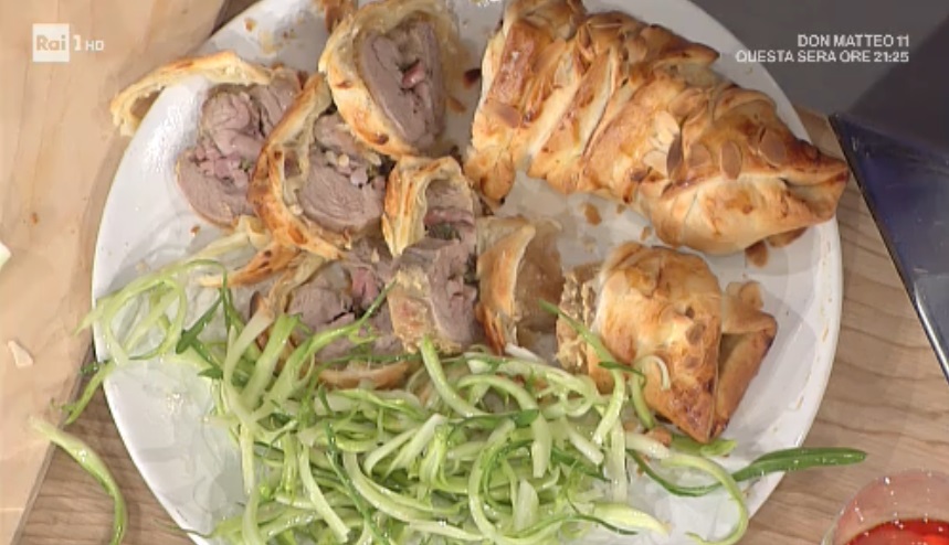 A questo punto spennelliamo un rotolo di pasta sfoglia con della senape. Posizioniamo sopra l’arrosto già cotto e raffreddato. Spennelliamo anche quest’ultimo con la senape. Avvolgiamo con la pasta sfoglia che dev’essere ben fredda e sigilliamo i bordi. Spennelliamo con l’uovo sbattuto con un po’ di latte, spolveriamo con le mandorle a lamelle ed inforniamo a 180° per 20 minuti, quindi alziamo a 200° fino a doratura.