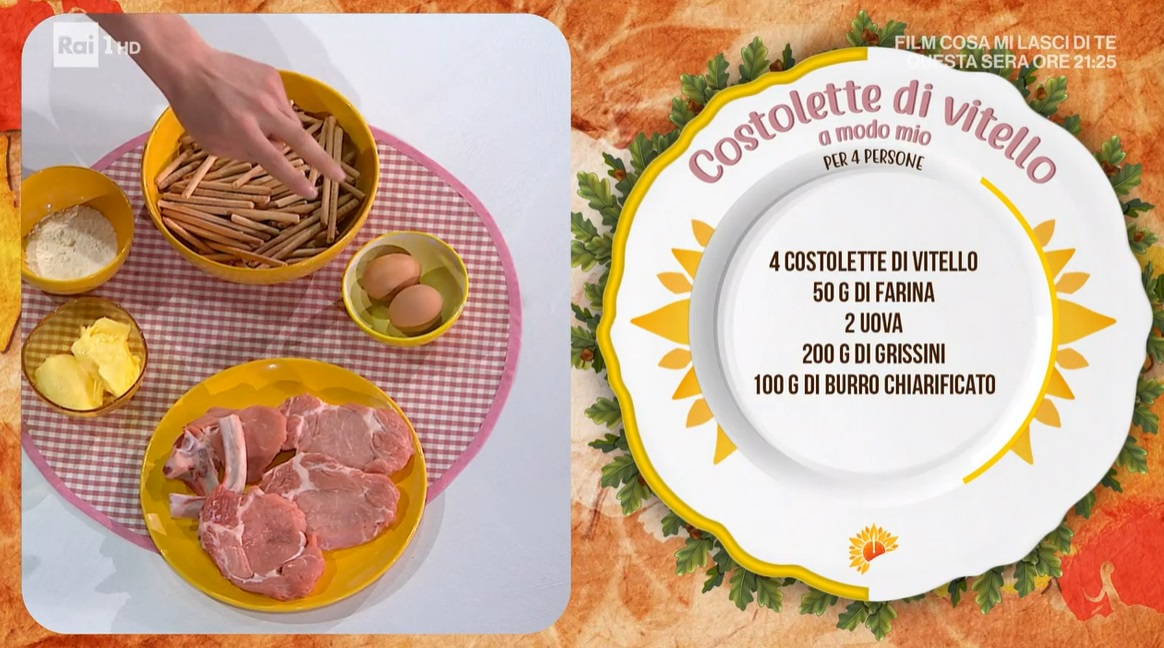 - 4 costolette di vitello, 50 g farina, 2 uova, 200 g grissini, 100 g burro