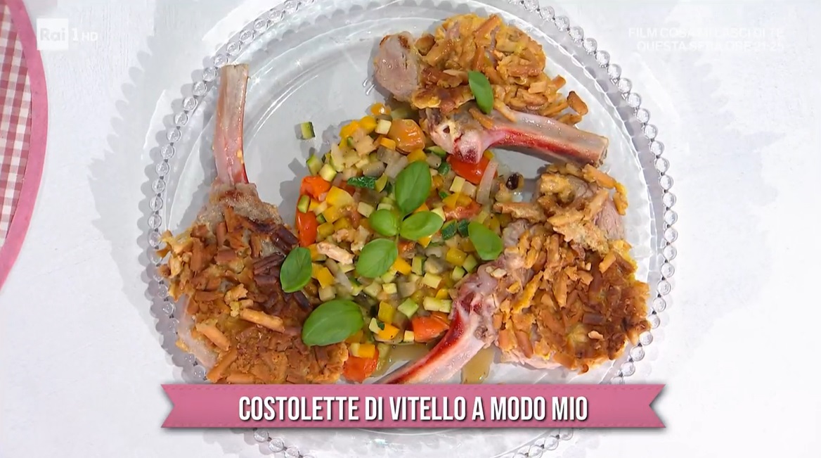 Per il contorno, in padella, scaldiamo un filo d’olio con la cipolla tritata, lo zucchero ed il succo d’arancia. Uniamo le verdure a dadini piccoli e lasciamo rosolare. Uniamo anche i pomodorini a pezzetti e proseguiamo la cottura. Sale, pepe ed uniamo le olive. Profumiamo con il basilico e completiamo la cottura.