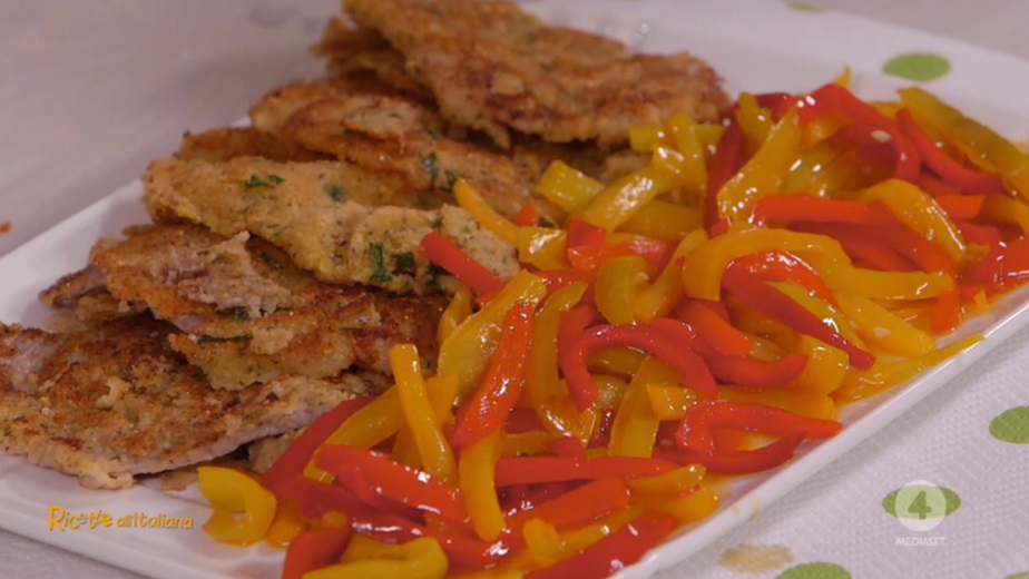 • 500 g fettine di vitella, 2 uova, 30 g pecorino, pangrattato, mollica di pane, farina, origano, prezzemolo, aglio, aceto rosso, sale, pepe, 250 g peperoni in agrodolce