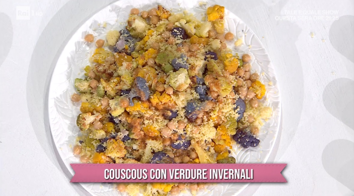 - 360 g cous cous, mezzo cavolfiore arancione, mezzo cavolfiore verde, mezzo cavolfiore viola, 240 g ceci cotti