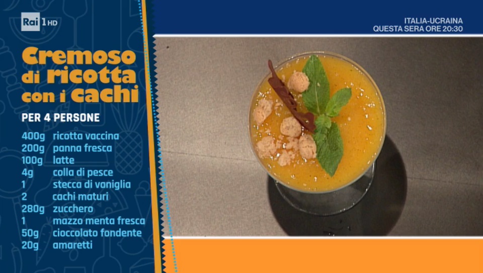 - 400 g ricotta vaccina, 200 g panna fresca, 100 g latte, 4 g colla di pesce, 1 stecca di vaniglia, 2 cachi maturi, 280 g zucchero, 1 mazzo menta fresca, 50 g cioccolato fondente, 20 g amaretti,