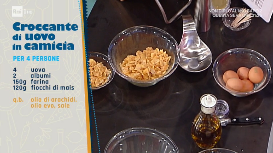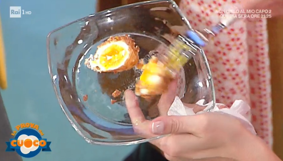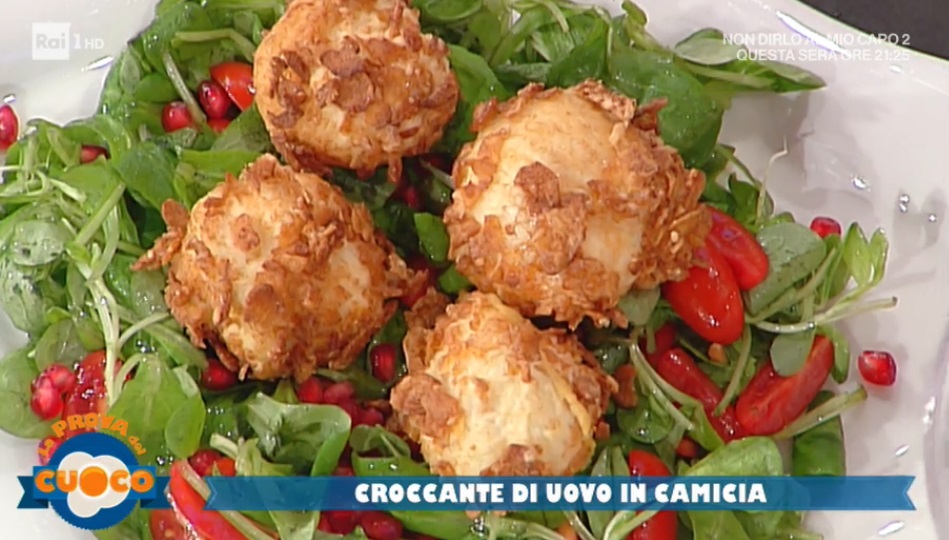 A parte, sbattiamo l’albume con il sale utilizzando una forchetta. In una ciotolina mettiamo i fiocchi di mais, quelli della colazione. A questo punto passiamo l’uovo sodo nella farina, nell’albume sbattuto e nei fiocchi di mais. Immergiamo l’uovo panato nell’olio profondo e ben caldo. Lasciamo friggere pochi istanti, fino a doratura. Lasciamo sgocciolare su carta assorbente. Serviamo su un letto di insalatina mista (valeriana, pomodorini e chicchi di melagrana).