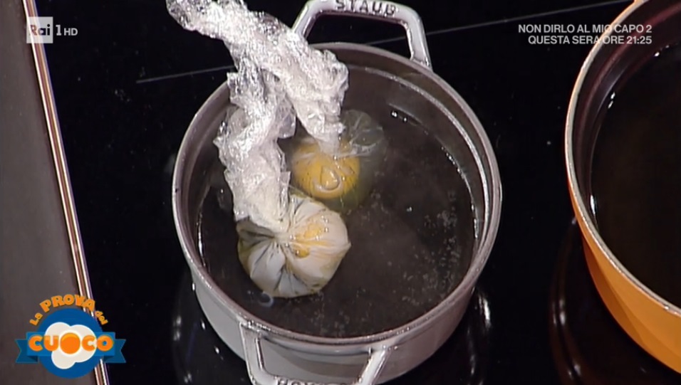 Foderiamo una ciotolina con della pellicola. Ungiamo con l’olio la pellicola, quindi inseriamo l’uovo intero sgusciato e richiudiamo la pellicola sull’uovo, togliendo tutta l’aria. Immergiamo la ‘bolla’ ottenuta in acqua quasi a bollore. Ci vorranno 5 minuti per un uovo a temperatura ambiente. Una volta rassodato, lasciamo raffreddare l’uovo. Spacchettiamo: otterremo una sorta di mozzarellina.