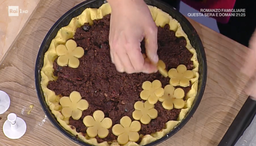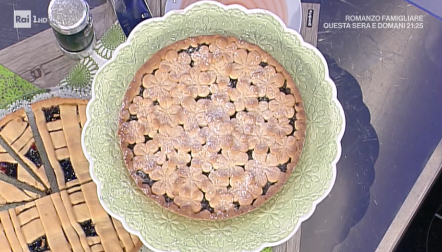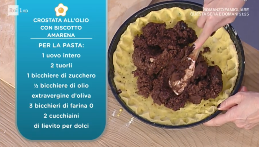 Stendiamo con il mattarello, con l’aiuto di poca farina. Posizioniamo il disco ottenuto all’interno di una teglia per crostata (24-26 cm) ben imburrata ed infarinata (oppure utilizziamo lo staccante per teglie di Natalia, qui la ricetta). Formiamo anche il bordino con un cordoncino di impasto. Posizioniamo all’interno il ripieno all’amarena. Copriamo il ripieno con dei fiorellini di frolla o semplicemente con un altro disco di frolla all’olio o delle striscie. Inforniamo a 180° per 45 minuti, forno statico.