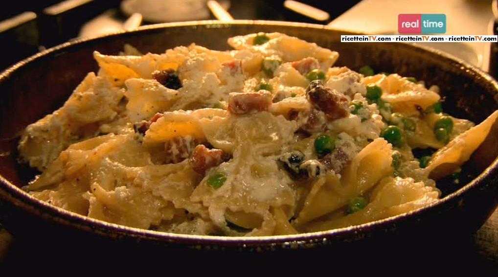Facciamo soffriggere la pancetta con un filo d’olio, uniamo l’aglio tagliato finemente e spegniamo il fuoco. Intanto, cuociamo le farfalle in acqua bollente e salata. Poco prima di ultimare la cottura, aggiungiamo i piselli nella pentola con la pasta. Quindi scoliamo ed uniamo alla pancetta. Mantechiamo con un cucchiaio di panna acida. Completiamo con la ricotta e del pepe nero.