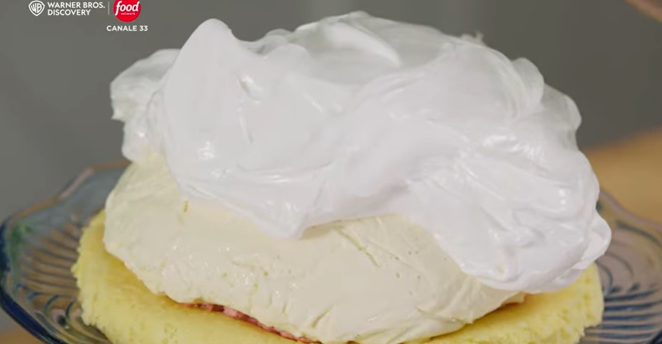 Meringa: con le fruste, cominciamo a montare gli albumi a neve aggiungendo da subito metà dello zucchero. Ottenuta una meringa lucida e densa, aggiungiamo gli zuccheri rimasti setacciandoli e mescoliamo con una spatola dal basso verso l’alto.