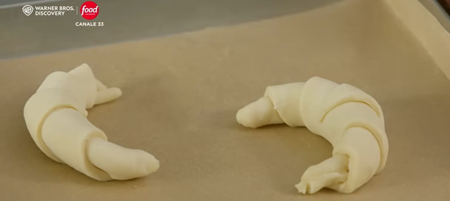 Stendiamo la sfoglia ad uno spessore di circa 2-3 mm. Ritagliamo dei triangoli, che arrotoliamo su se stessi, partendo dalla base: otterremo i croissant. Li disponiamo su una teglia e li lasciamo riposare per 30 minuti / 2 ore. Spennelliamo la superficie con tuorlo sbattuto con poca acqua e cuociamo in forno caldo e statico a 180° per 20-25 minuti.