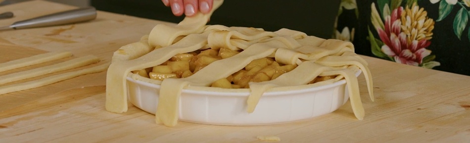 Distribuiamo tutte le mele all’interno del guscio di brisè ancora crudo. Livelliamo e rimettiamo in frigorifero. Con la brisè rimasta, i ritagli e quella tenuta da parte, creiamo un disco sottile, che dividiamo in 12 strisce. Le posizioniamo sulle mele, intrecciandole (foto).