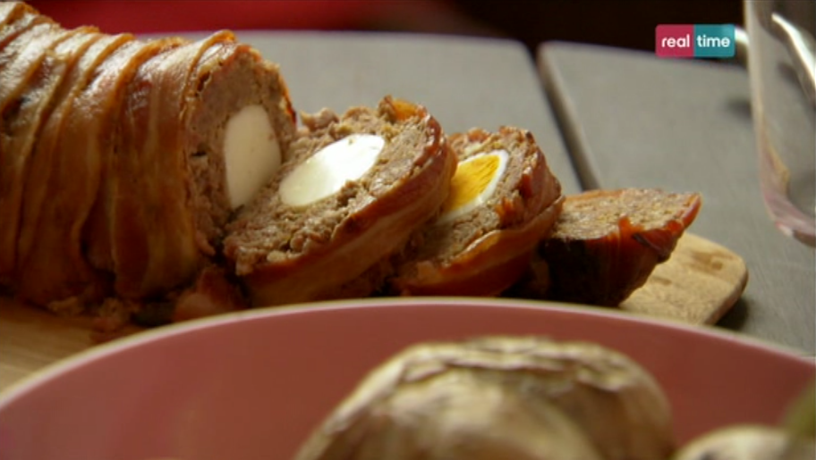Mettiamo del grasso d’anatra o del semplice burro (con un goccio d’olio evo) in padella. Mettiamo ad appassire abbondante cipolla (tanta da riempire la padella) tagliata a quadratini. Saliamo ed aspettiamo che dorino. Intanto, prendiamo 900 g di manzo macinato fresco, amalgamiamo con un uovo, salsa worcester e 500 g di pangrattato; uniamo la cipolla dorata ed impastiamo il tutto con le mani. Prendiamo la metà dell’impasto e diamo una forma ovale, appiattita. Scaviamo un solco al centro, disponiamo delle uova sode e copriamo con l’altra metà dell’impasto. Diamo la forma del polpettone, quindi lo rivestiamo con delle fette di pancetta. Inforniamo e lasciamo in forno finchè la superficie non si è dorata.