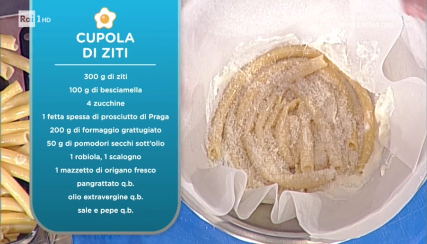 Spennelliamo con l’olio una ciotola a mezza sfera e la foderiamo con la carta forno. Spalmiamo sul fondo un paio di cucchiai di besciamella. Disponiamo gli ziti a spirale, coprendo il fondo ed i lati. Spolveriamo con il formaggio grattugiato. Mettiamo qualche zucchina trifolata, pomodori secchi a pezzetti e del prosciutto di Praga a pezzetti. Copriamo con altri ziti, besciamella e proseguiamo come in precedenza. Quando arriviamo a metà altezza dello stampo, posizioniamo al centro una robiola intera. Copriamo con i condimenti, gli ziti e facciamo altri strati fino ad arrivare al bordo dello stampo. Finiamo con ziti e formaggio grattugiato. Inforniamo a 180° fino a far dorare il tutto. Appena sfornata, la lasciamo intiepidire 10 minuti, quindi la capovolgiamo su un piatto da portata.