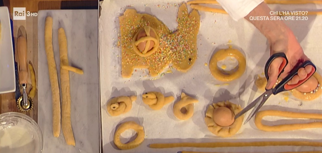 Quando avrà assunto la giusta consistenza, dividiamo l’impasto in piccoli pezzi di circa 100 grammi circa e ricaviamo dei cilindretti lunghi 30 cm. Prendiamo le due estremità e le attorcigliamo su se stesse, a cordoncino, quindi le chiudiamo a ciambellina, unendo le punte. A piacere, decoriamo con le uova crude, inserendole nelle anse e fissandole con dei bastoncini sottili di impasto. Cuociamo i taralli in forno caldo a 180 °C per 30 minuti circa o fino a che non assumono una colorazione dorata.