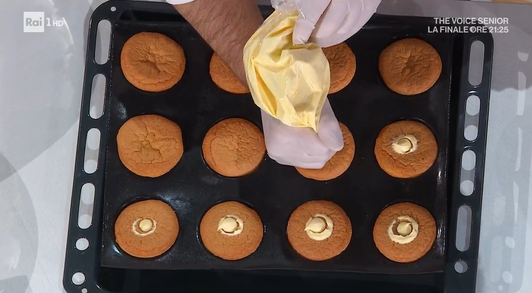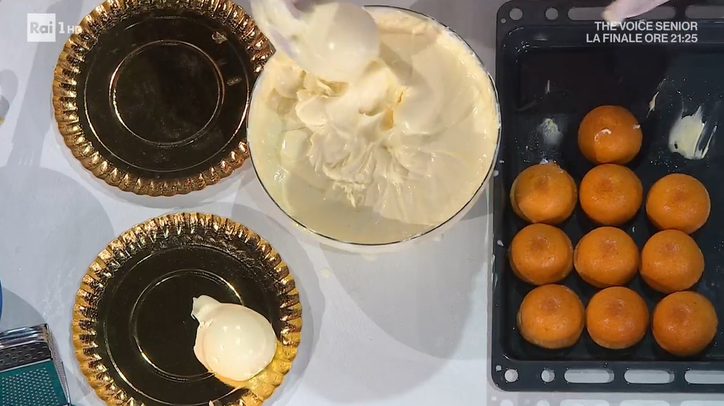 Immergiamo le cupolette di pan di Spagna nella crema resa più fluida, in modo da glassarle completamente. Le disponiamo sul piatto a portata e decoriamo a piacere.