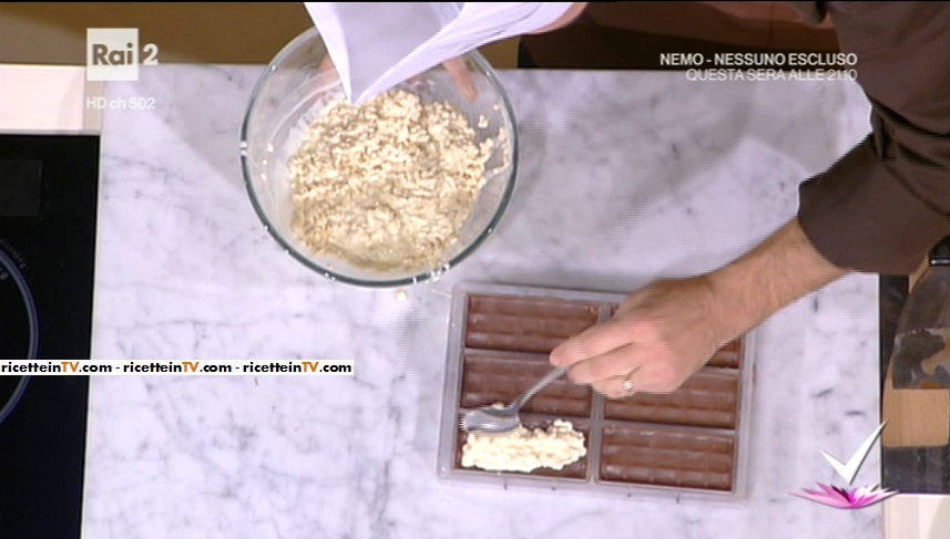 Intanto, sciogliamo anche il cioccolato bianco. Se troppo denso, aggiungiamo un cucchiaino di olio di semi. Uniamo il riso soffiato o il cereale prescelto, quindi, servendoci di un cucchiaino, trasferiamo il composto ottenuto all’interno della camicia di cioccolato al latte. Trasferiamo in frigorifero per 10 minuti, quindi facciamo riposare almeno 1 ora prima di consumare.