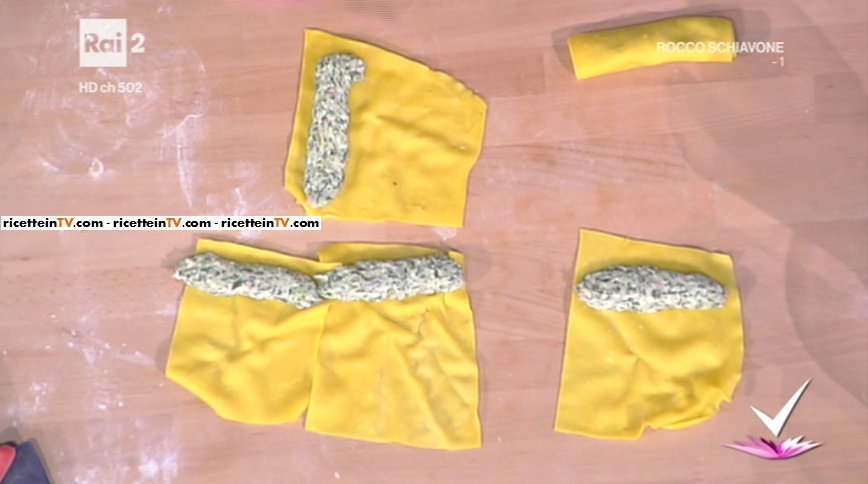 Per la sfoglia: impastiamo le uova con la farina, sino ad ottenere un composto omogeneo e compatto. Dev’essere anche liscio ed elastico. Copriamo il panetto con la pellicola e lo lasciamo riposare per almeno 30 minuti. Stendiamo la pasta in modo da ottenere una sfoglia di medio spessore. Ricaviamo dei quadratoni di circa 10-12 cm per lato. Sbollentiamo, per 2 minuti, i quadratoni di pasta. Li scoliamo e li immergiamo in acqua fredda, ghiaccio e una manciata di sale grosso. Scoliamo e lasciamo asciugare su un canovaccio pulito.