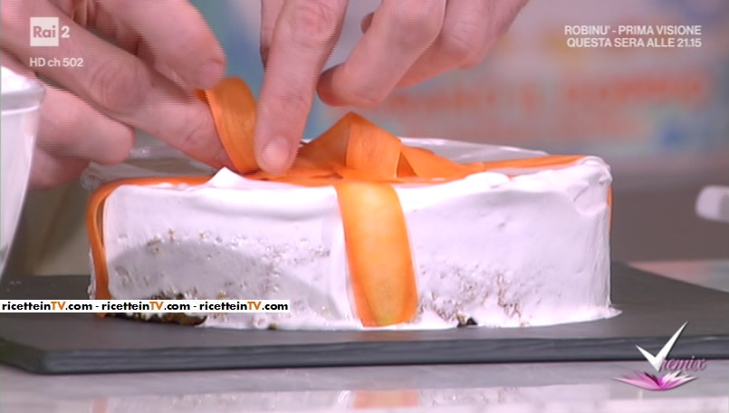 Per la decorazione: tagliamo la carota sottilissima, utilizzando un pelapatate. Cuociamo le fettine di carota in un pentolino, con l’acqua e lo zucchero. Facciamo cuocere un paio di minuti. Le scoliamo e le facciamo raffreddare. Le adagiamo sulla torta glassata, in modo da formare il nastro ed il fiocco di un pacchetto regalo.