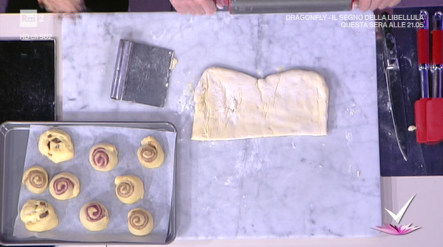 Arrotoliamo l’impasto così condito su se stesso, partendo dal lato più lungo, in modo da formare un rotolo. Tagliamo quest’ultimo a fette spesse 2 cm. Disponiamo le fette sulla carta forno. Lasciamo lievitare ancora 40 minuti a 30°.