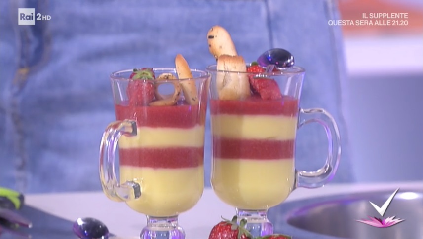 All’interno del bicchiere, formiamo uno strato di bavarese. Facciamo indurire in frigorifero. Quindi formiamo uno strato di gelatina di fragole. Facciamo indurire ancora in frigorifero, quindi coliamo sopra altra baverese, facciamo indurire e formiamo un ultimo strato di gelatina di fragole. Decoriamo con biscotti lingue di gatto e frutta fresca.