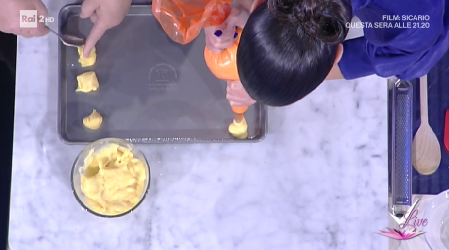 Formiamo dei ciuffetti di composto su una teglia con carta forno. Possiamo farli anche con un cucchiaino, adagiando sulla teglia delle palline di composto. Cuociamo in forno preriscaldato a 200° per 15 minuti circa. Devono essere ben dorati.